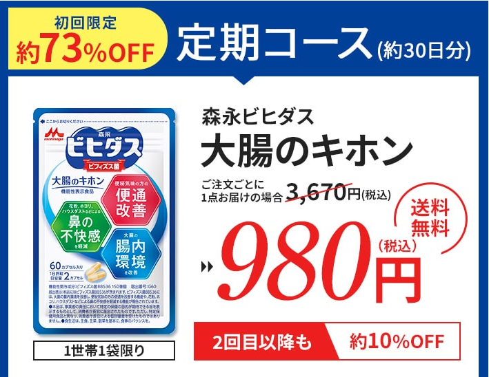 本品にはビフィズス菌BB536が含まれます。ビフィズス金BB536には、大腸の腸内環境を改善し、便秘気味の方の便通を改善する機能や、花粉、ホコリ、ハウスダストなどによる鼻の不快感を軽減する機能が報告されています。