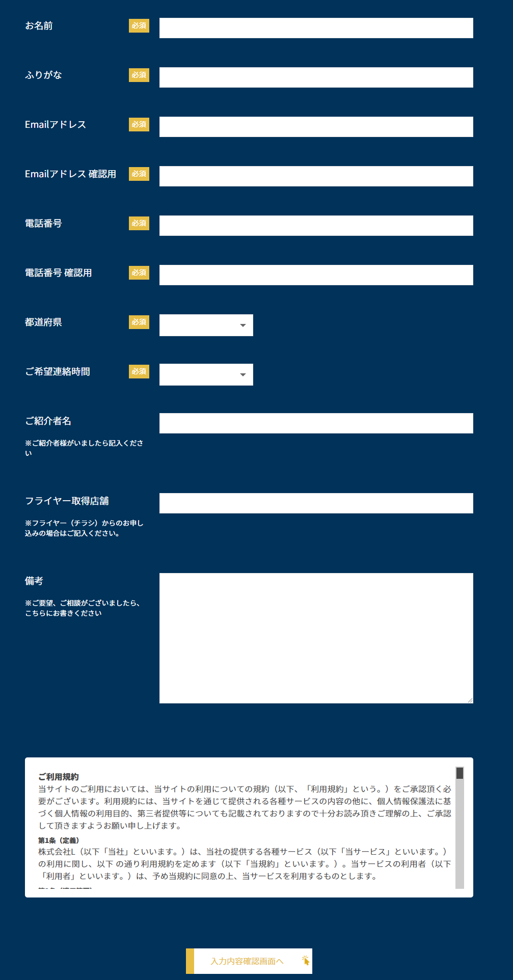 まずは、公式サイトのお問い合わせフォームにお名前、連絡先、住所、連絡希望時間を入力して申し込みをします。