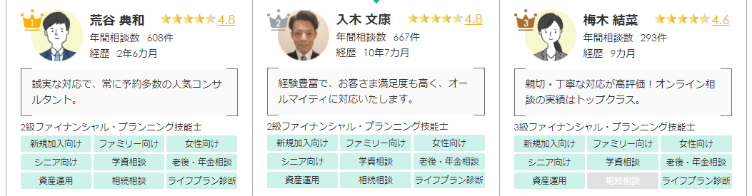 保険市場ではコンサルタントを指名して相談できるスタイルになっているため、相談実績や口コミをみて選ぶことが出来るのも安心です。もちろんファイナンシャルプランナーの資格を持ったお金のプロです!