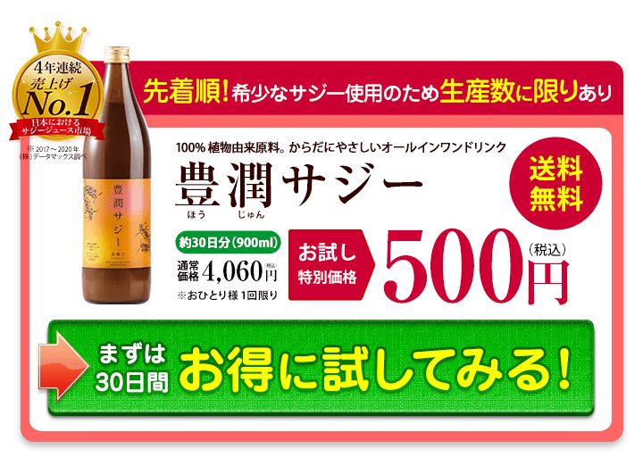 日本におけるサジージュース市場4年連続売上げNo.1の信頼のサジージュースをお得に試せるチャンスです。