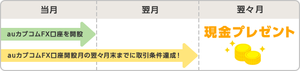 • auカブコムFX口座開設月の翌月末までにauカブコムFXの新規取引