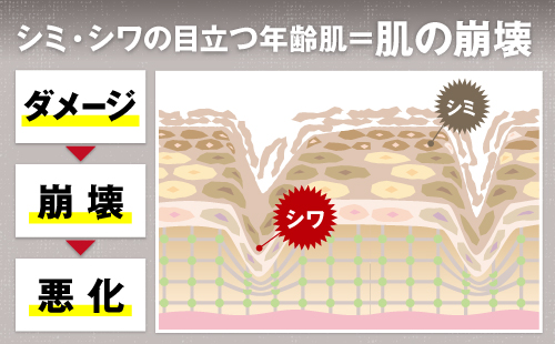 老け肌とは、下の図のように乾燥や紫外線などのダメージで肌が崩壊してしまった状態のこと。