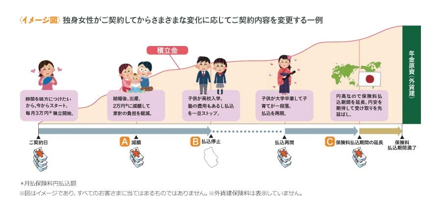 こだわり個人保険(外貨建」は払込に関するさまざまなニーズに寄り添うように応えてくれます