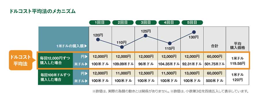例えば、月々一定額の「円」を払い込むタイプなら、「外貨が安いときに多く購入し、外貨が高いときに少なく購入する」というドルコスト平均法で為替変動リスクに対応できます。