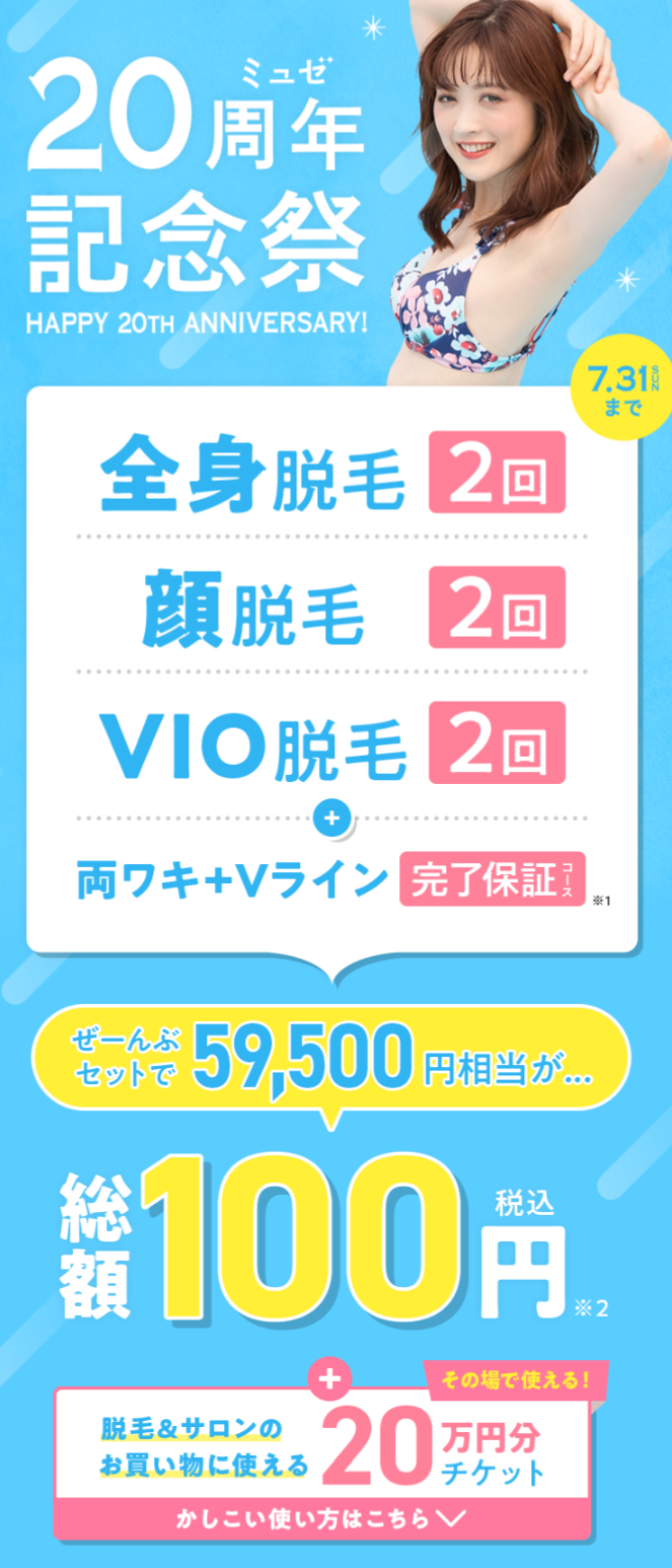 ミュゼが初めての人に限り、一番ムダ毛が気になる両ワキ、Vラインの完了保証コースと、全身脱毛2回+顔脱毛2回+VIO脱毛2回がセットになって、通常59,500円相当のコースがたったの100円なんです!!!